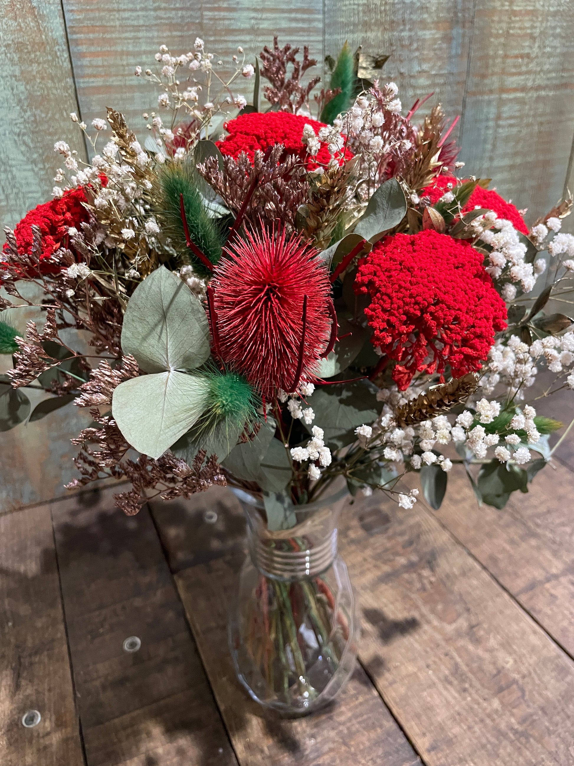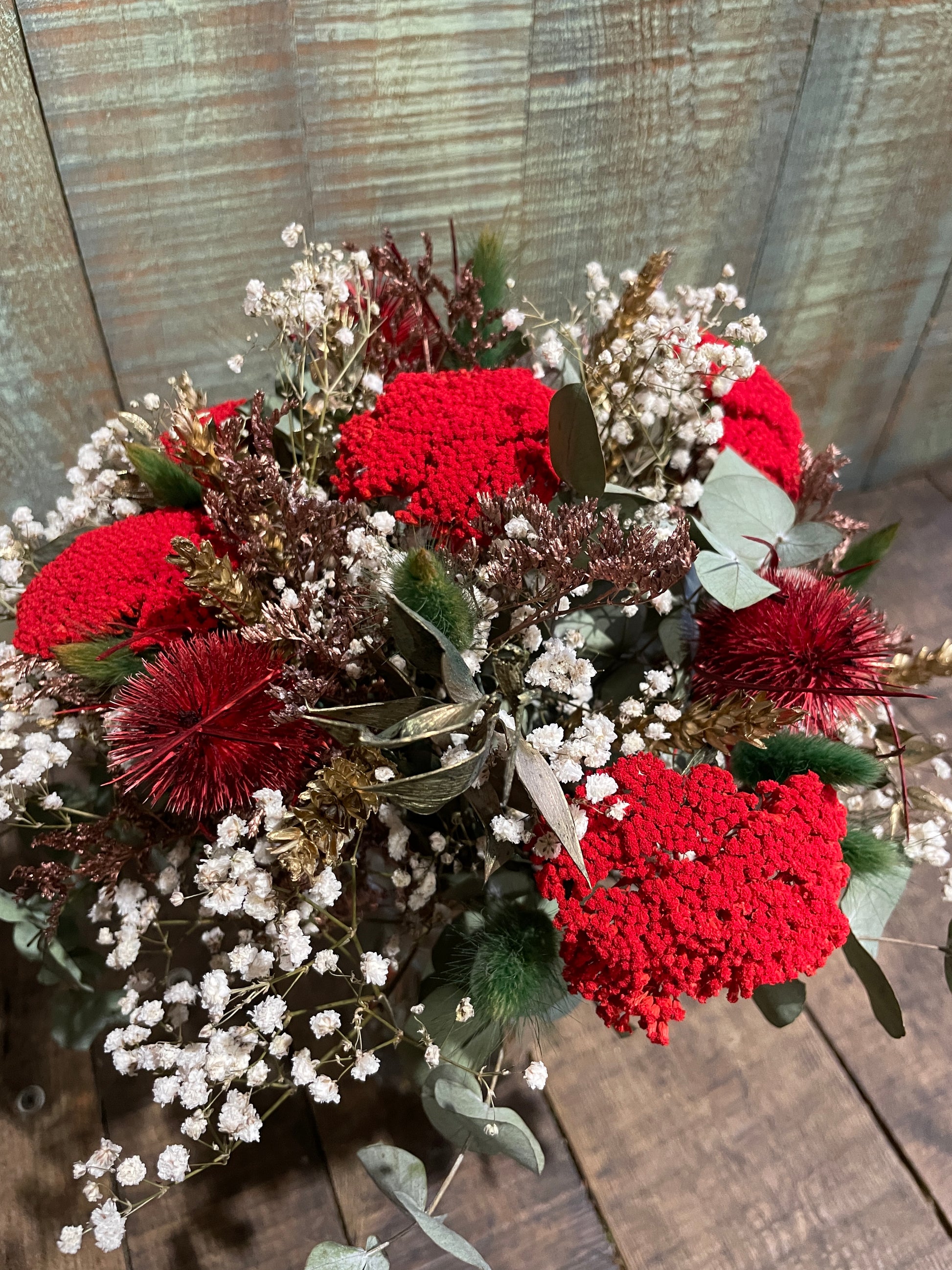 Bouquet de Fleurs séchées aux couleurs de Noël : Chardon, Lagurus, Achilée, Ruscus, eucalyptus, gypsophile